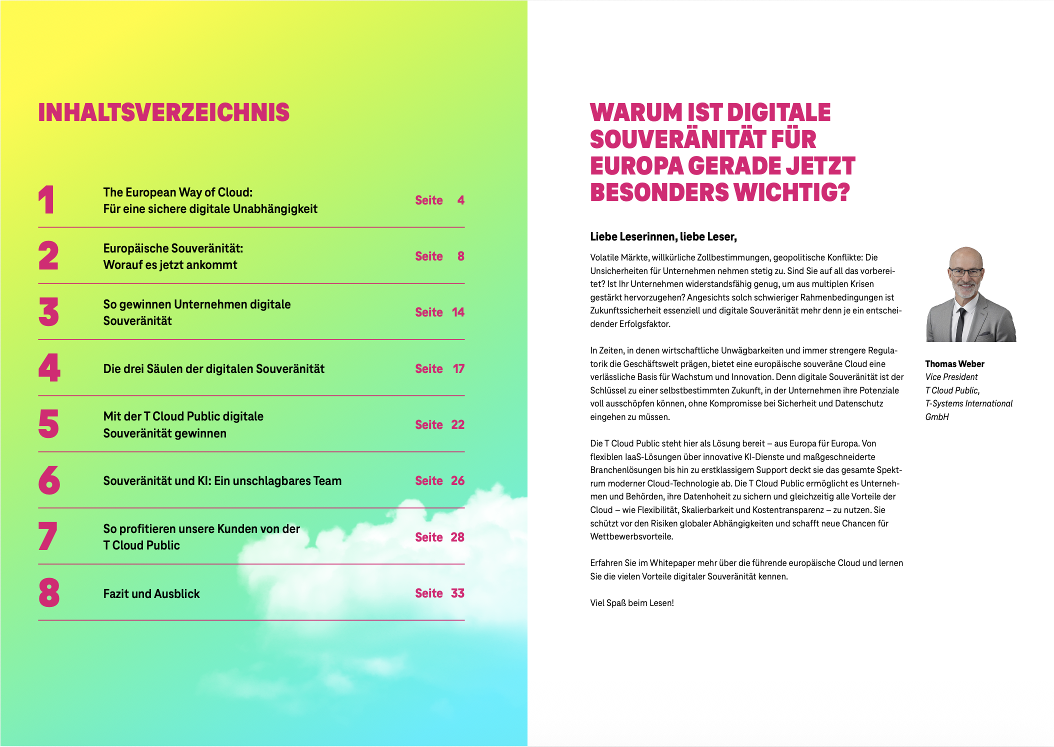 Erfahren Sie im neuen Whitepaper der T Cloud Public, warum Europas digitale Unabhängigkeit immer wichtiger wird und welche Rolle souveräne Cloud-Lösungen dabei spielen. Das Whitepaper liefert fundierte Zahlen zu den Wünschen und Anforderungen von Unternehmen, beleuchtet zentrale Erfolgsfaktoren wie offene Standards und Datenschutz und zeigt, wie die T Cloud Public konkrete Mehrwerte schafft – von Branchenlösungen bis zu KI-Anwendungen. Profitieren Sie von praxisnahen Einblicken, aktuellen Marktdaten und Kundenbeispielen. Jetzt kostenlos herunterladen und mehr über den „European Way of Cloud“ erfahren!