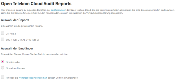 Wir freuen uns, Ihnen mitteilen zu können, dass die Audit Reports (SOC, C5) der T Cloud Public ab sofort über ein benutzerfreundliches Self-Service Portal innerhalb myWorkplace heruntergeladen werden können.