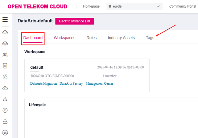 To access Tags in DataArts Studio please select first the DataArts Studio Dashboard as follow: